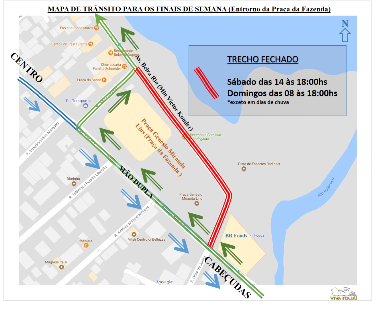 Sábado a Beira-rio ficará fechada das 14h às 18h. No domingo, das 8h às 18h. A Coordenadoria de Trânsito de Itajaí (Codetran) garantirá a segurança no local. Não haverá bloqueios em dias de chuva.